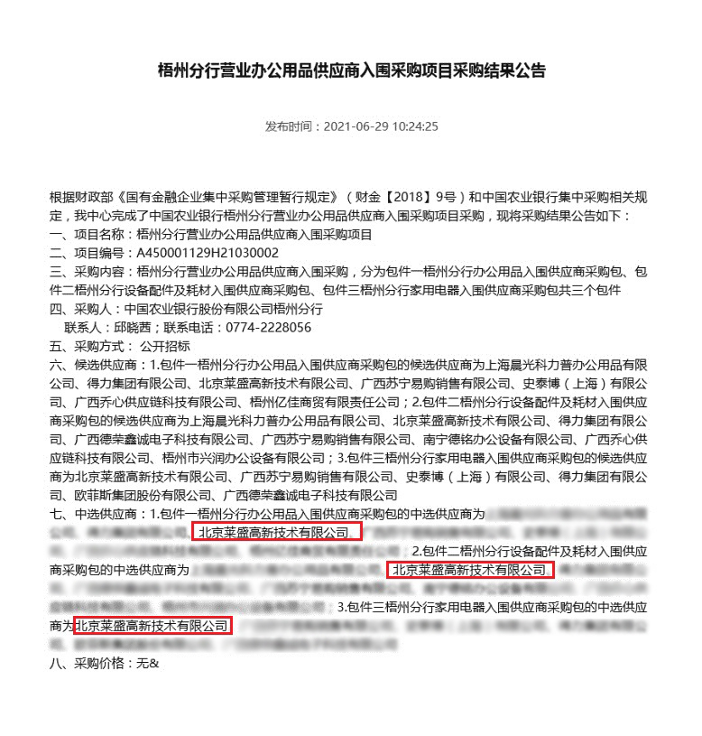 2021年6月29日,金采網公布了梧州分行營業(yè)辦公用品供應商入圍采購項目【項目編號:A450001129H21030002】的中選名單;北京萊盛高新技術有限公司順利入選,成為中選供應商。感謝農業(yè)銀行梧州分行對北京萊盛高新技術有限公司的肯定和支持。北京萊盛通過定制個性化辦公服務方案、憑借專業(yè)的服務、幫助更多企業(yè)節(jié)約成本,提升辦公效率。隨著政府單位采購的需求加大,我們將繼續(xù)努力。